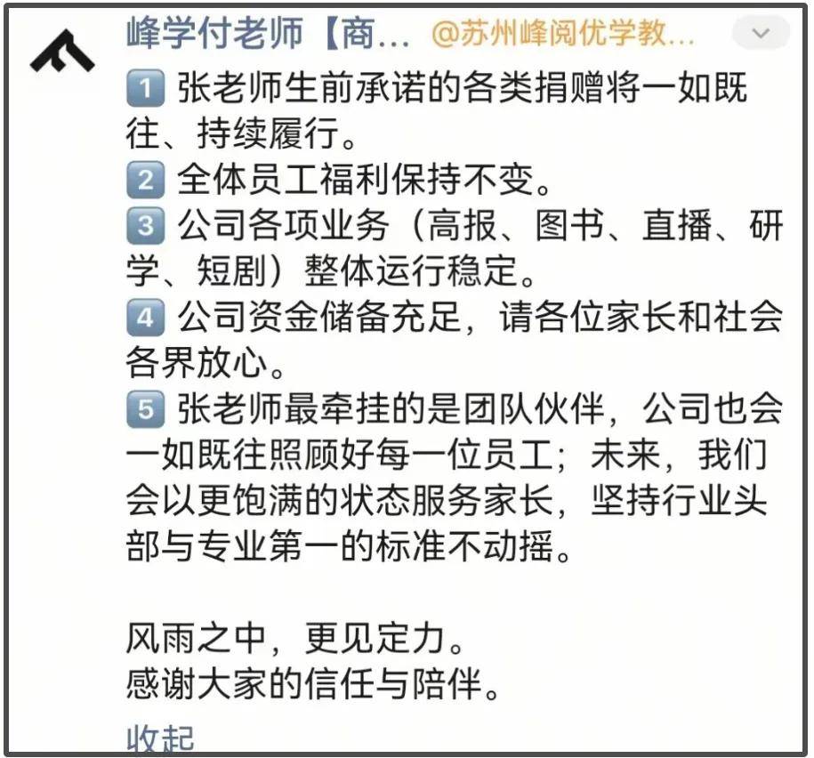 还有网友晒出疑似张老师现任的朋友圈——峰学付老师发文,针对张老师生前的慈善捐赠,到员工福利,再到公司业务,和团队等问题,一一作出了回应,看上去不像普通员工,不过张老师团队也不止一个付老师,至于是不是前任,还有待考证。