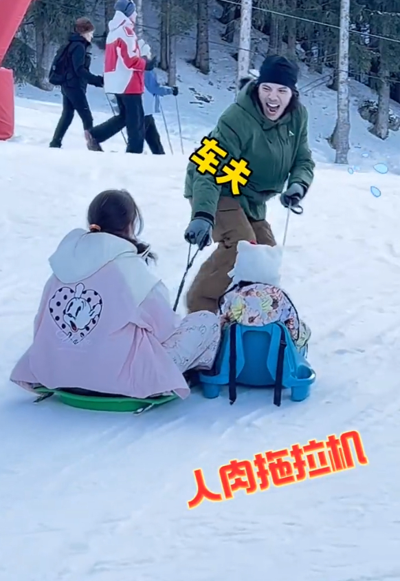在滑雪过程中,向佐很照顾妻子和孩子,他充当“车夫”,拉着郭碧婷和孩子往前滑,坐在滑雪板上的郭碧婷乐开了花,俩孩子也玩得很开心,向佐累而幸福着。