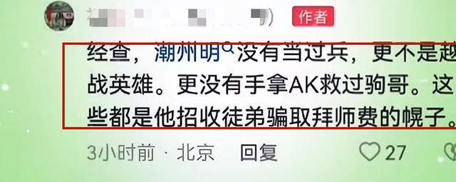 总结来说,只要进驻网络,并讲述过往的一些事情,那么他的目的无非有两个,第一是落魄,第二是赚钱,两者本质一样,潮州明也是如此,不过他的途径并不是单纯的网络,而是依靠网络收徒。