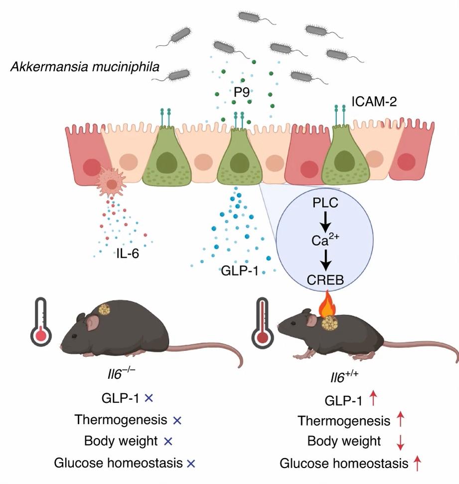 比利时鲁汶大学等发表的研究表明,AKK菌的减脂机制很清晰:能够分泌P9蛋白激活棕色脂肪,减少脂肪堆积;同时刺激肠道提升GLP-1水平(一种天然的“食欲抑制激素”)可以增强饱腹感。