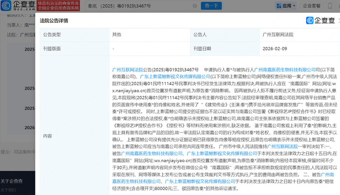 企查查APP显示,今年秦岚已起诉多方侵权,案由包括网络侵权责任纠纷、人格权纠纷。今年2月,法院公告其与广州南嘉医药生物科技有限公司、广东上影蓝鲸影视文化传媒有限公司网络侵权责任纠纷一案民事判决书,两被告被判公开道歉并赔偿秦岚赔偿经济损失8万元,判决生效后,被告拒不道歉,秦岚申请强制执行。此前,广州雨汐生物也曾因侵犯秦岚人格权公开致歉。