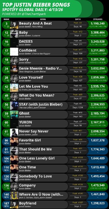 - 转型之作再攀巅峰:道歉神曲《Sorry》Spotify累计播放突破26亿,2025年为纪念发行十周年单日回流数据暴涨182%;合作单曲《Stay》全球Spotify播放量超22亿,连续11周霸榜Billboard全球200强。
