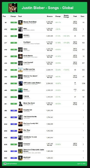 - 合作曲的数据杠杆:与The Kid LAROI合作的《Stay》成为2021-2023年全球最热单曲,Spotify累计播放量达34亿;与Luis Fonsi的《Despacito》97天破10亿播放,凸显其"跨文化合作"对流量池的扩容能力。