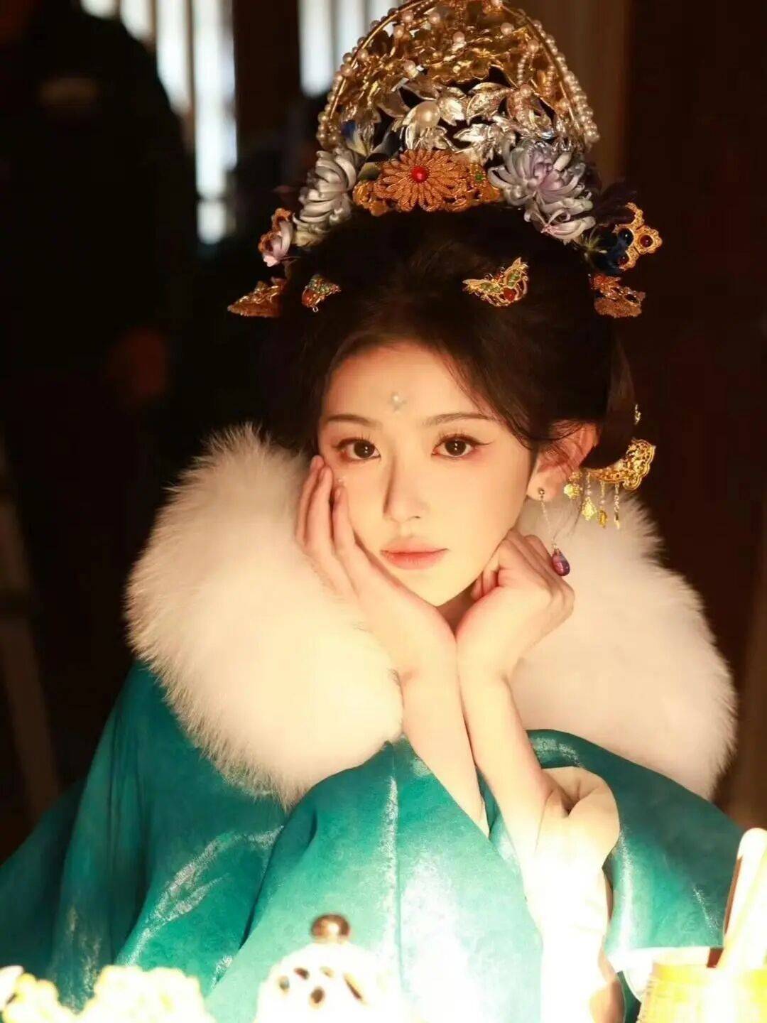 作为江南富商之女,她的妆造精致到骨子里:非遗绒花点缀发髻,皮草披肩衬得身姿曼妙,从粉色系的柔美到蓝色系的清冷,每一套服饰都尽显品味。