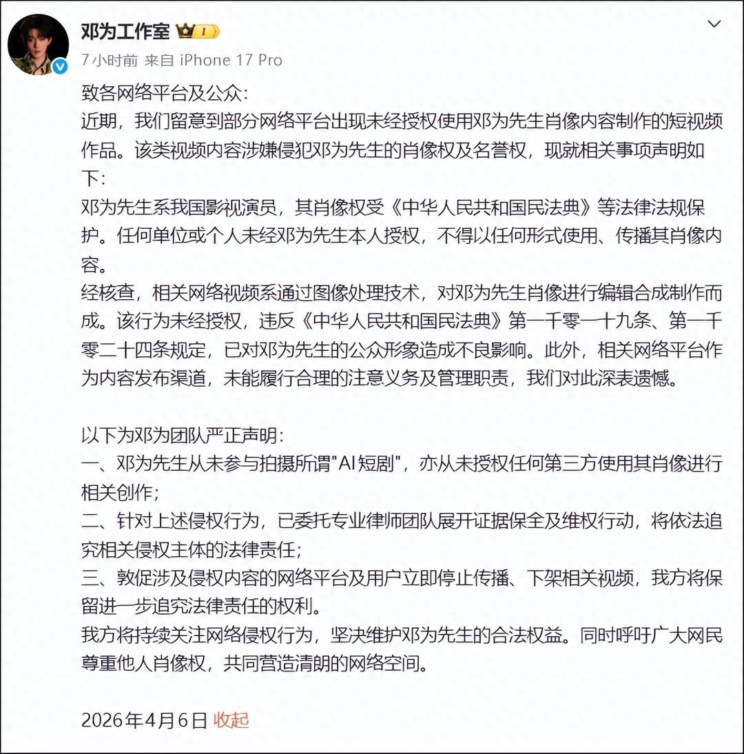 4月6日,演员邓为工作室通过官方微博发布严正声明,针对近日网络平台流传的以邓为肖像合成的“AI短剧”等侵权内容,明确表示将采取法律手段维权。