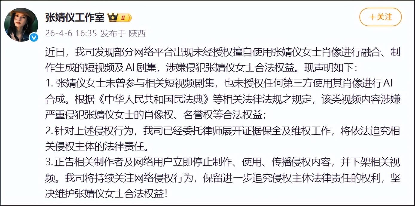 同日,张婧仪工作室也发布声明称,网络平台出现未经未经授权擅自使用张婧仪女士肖像进行融合、制作生成的短视频及AI剧集,涉嫌侵犯张婧仪女士合法权益,已委托律师开展证据保全及维权工作。