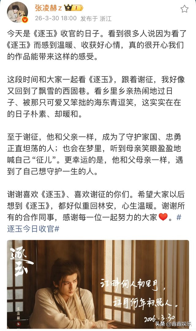 3月30日,古装剧《逐玉》正式收官,主演张凌赫发布走心小作文告别角色谢征,搭配手写诗句“江畔何人初见月,江月何年初照人。谢征,今日暂别”,1小时斩获34万赞,瞬间引爆全网。