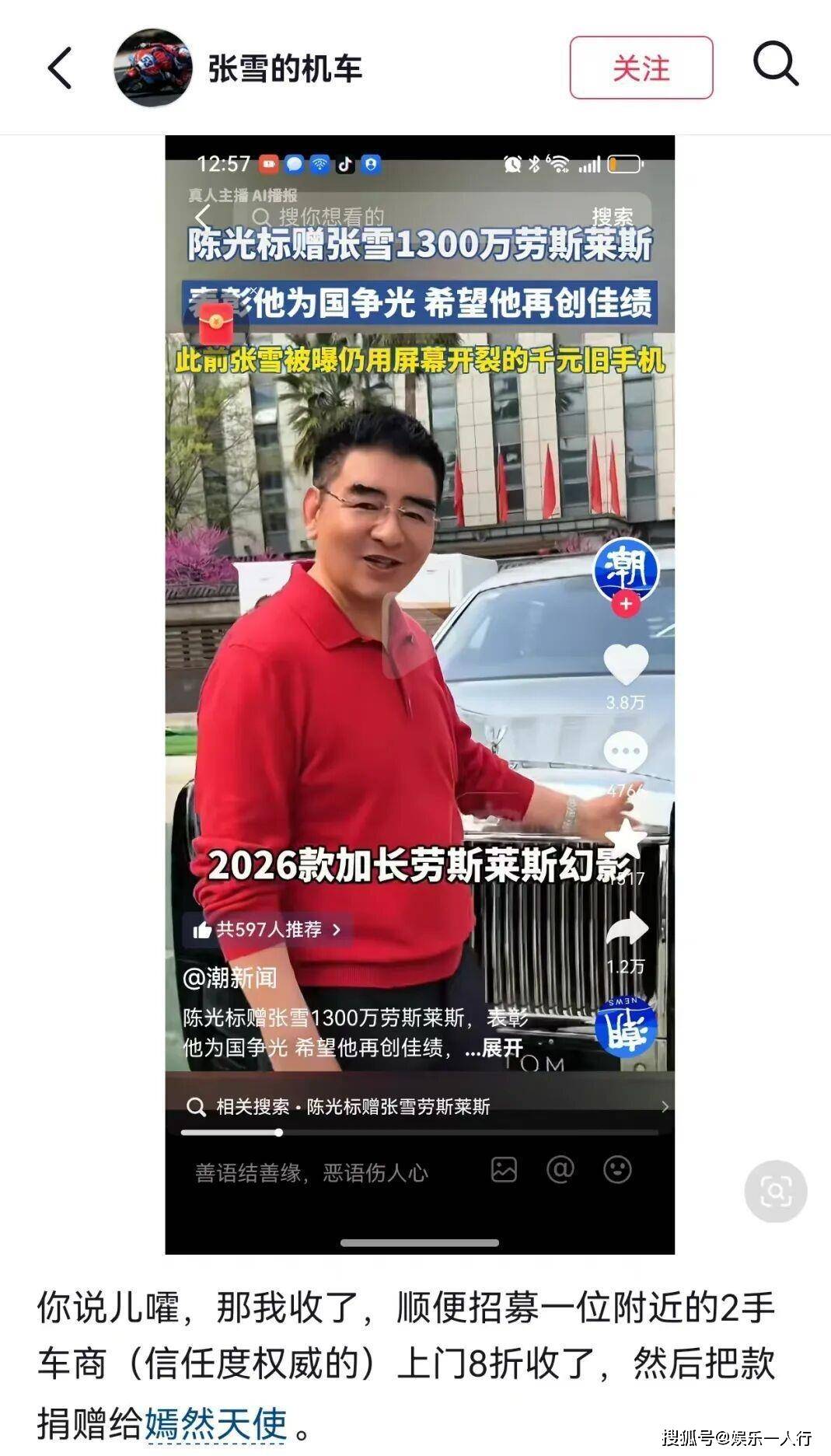 陈光标的剧本其实很清晰。4月1日,他在视频里情绪饱满,称张雪带着中国机车在世界顶级赛场WSBK连续夺冠,打破了国外几十年的垄断,是“中国的英雄”。为了表彰这份荣耀,他决定将公司刚购买的、“中国唯一一辆”2026款加长劳斯莱斯幻影,市场价1300万,赠予张雪“个人使用”,作为“接待用车”。视频点赞超过22万,评论3万多条,流量瞬间拉满。这套操作对陈光标来说驾轻就熟:高调宣布、制造话题、受赠者感恩、媒体传播、个人品牌强化,形成一个完美的流量闭环。他试图复刻过去“现金墙”、“街头发钱”的模式,用极具视觉冲击力和话题性的方式,完成一次“仪式化慈善”的表演。