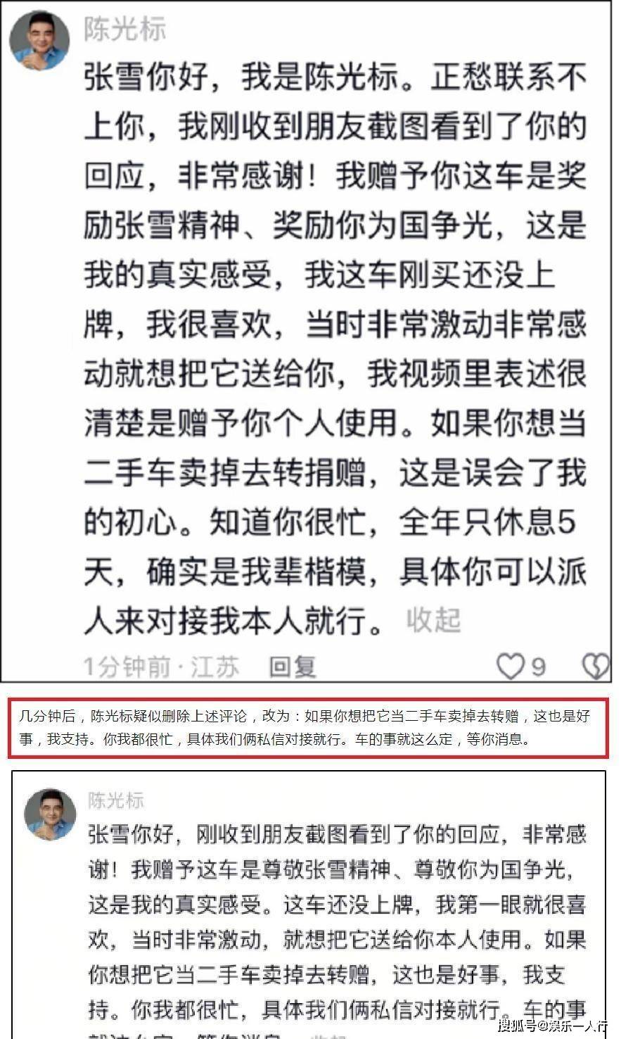 陈光标显然慌了。他先是在张雪的回应下留言:“我赠予这车是尊敬张雪精神……视频里表述很清楚是赠予你个人使用。如果你想当二手车卖掉去转捐赠,这是误会了我的初心。”这几乎是本能地抗拒,试图把偏离的剧本拉回正轨。但短短几分钟后,这条留言被删除,取而代之的是另一段话:“我赠予这车是尊敬张雪精神……如果你想把它当二手车卖掉去转赠,这也是好事,我支持。你我都很忙,具体我们俩私信对接就行。车的事就这么定,等你消息。”从“误会初心”到“支持转赠”,态度180度大转弯,暴露了他在这场交锋中的被动与尴尬。