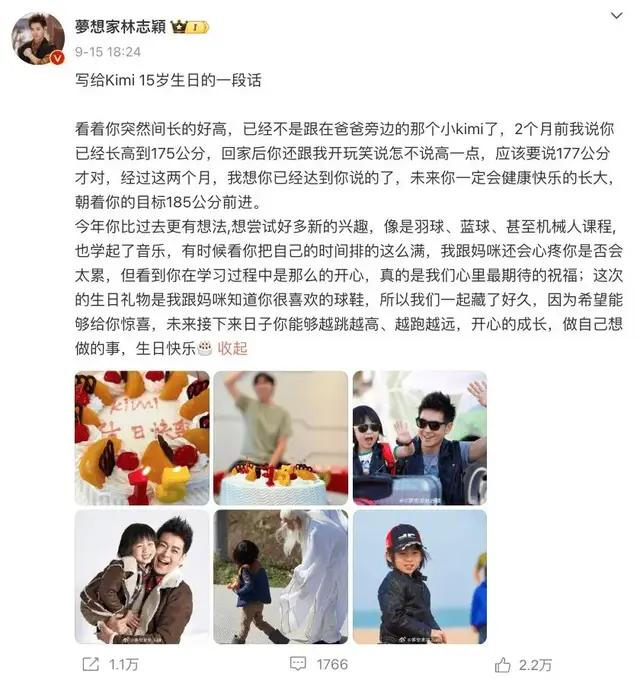 Kimi15岁生日的时候,林志颖留言透露,儿子兴趣广泛,喜欢羽毛球、篮球跟机械人课程,同时也学起了音乐。
