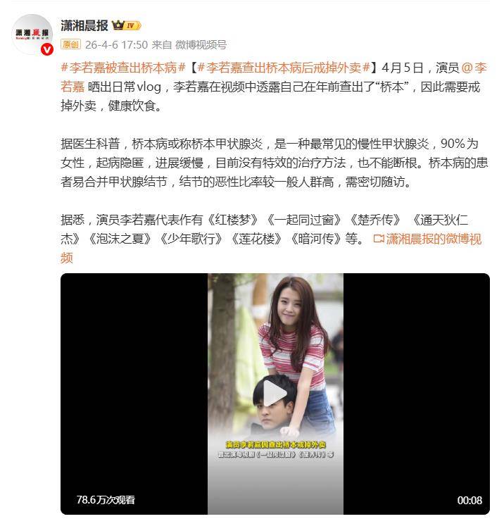 ## 《吃瓜记录》:这次"光头"自曝,李若嘉的健康Vlog更配一顿烧烤?, , 4月5日,演员李若嘉的一条日常Vlog意外点燃了网友们的健康热议,这位曾经低调实力派的"影星佳人",直接从"红楼"的清纯学姐到"泡沫"里的温柔女主,转身自曝"桥本病",这波操作堪称"吃瓜界限破圈"啊!, , 桥本病,听着就让人想起那些"躺平"的俱乐部成员,医学界称之为桥本甲状腺炎,最常见的慢性甲状腺炎,高达90%的患者都是女性,年轻女性的健康问题,这盘棋看起来真的太"绝了"!年前年初的体检报告单上"桥本病"两字,就这么悄悄藏在了这位影后精英的健康档案里,谁能想到,在这个追求"佛系"、"躺平"的年代,一个自家也有"病根"的明星,反而是成了"清醒又自律"的标杆?, , 在网友眼中,李若嘉的这次"自曝"堪称"真香",果断戒掉多年依赖的外卖,重新开启健康饮食模式,这波操作,堪称"大牌",严格控制碘的摄入,调整饮食结构,坚持抗炎饮食,这些做法简直就是"医生给的处方",网友们纷纷感叹:"比起拼资源拼流量,能管住嘴、为自己健康负责的演员更难得。", , 这次"健康Vlog",或许才是李若嘉最励志的作品,高强度工作、不规律作息、长期依赖外卖,这些看似光鲜的"年轻人标配",正在让越来越多的年轻人收到身体的"红票",桥本病的年轻化趋势,正如一面警钟。, , 健康饮食,真的是当代年轻人的终极大战,无论是"躺平"的达人,还是拼命打卡的社畜,都需要学会照顾好自己的身体,毕竟,健康的体魄才是最好的"代表作",李若嘉的"健康Vlog",或许比任何一部剧都更有现实意义,它提醒着每个人:在追逐事业与生活的路上,管理好身体才是最重要的"长期项目"。, , 在这个人人都能拍出健康Vlog的时代,或许我们都应该向李若嘉这位"健康明星"学习,毕竟,健康饮食才是当代年轻人的终极大战,而这场战役,必须由自己来打。