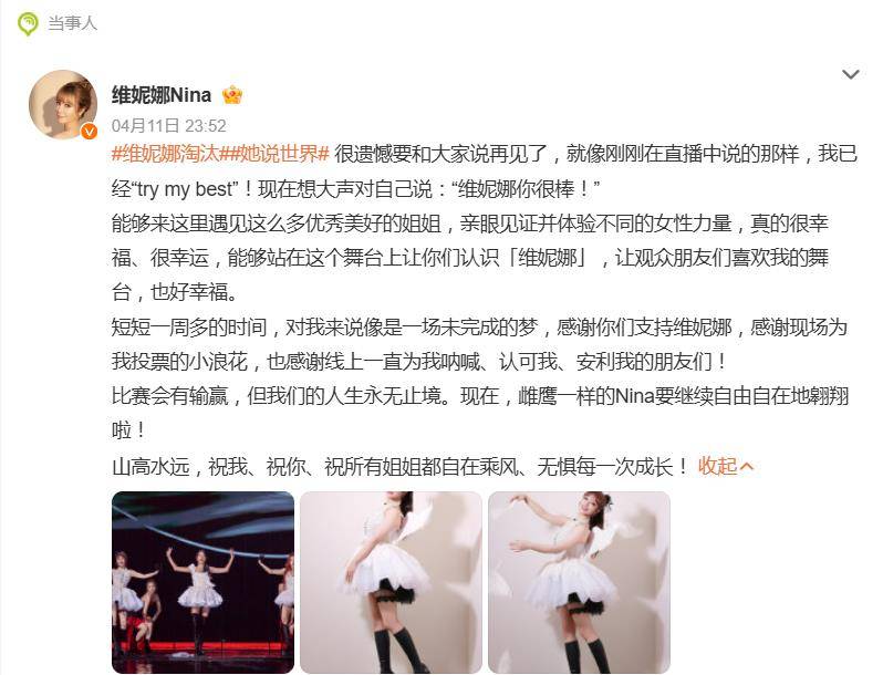 淘汰后的维妮娜,呈现给公众的是积极一面。她在社交媒体发文“雌鹰要继续翱翔”,姿态洒脱。但私下流露的细节却勾勒出另一幅画面:她曾透露“已准备好二公服装”,得知结果后崩溃大哭。直播中,她哭着表达对舞台的眷恋,渴望复活赛机会:“如果有机会,还想再唱一首歌,再见见姐姐们。”最令人唏嘘的是后台画面——她先是微笑着挥手告别,转身离开镜头后却蹲地痛哭,强烈的反差感戳中了无数观众。