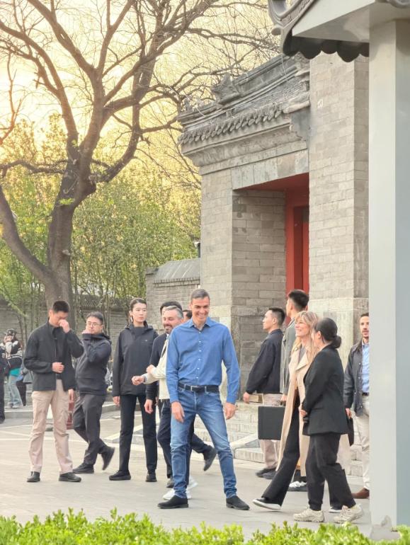 晚上,西班牙首相夫妇游什刹海被网友偶遇;只见桑切斯还是穿西服与牛仔裤,只不过衬衫换成了白色,一身混搭风依然帅气有型!