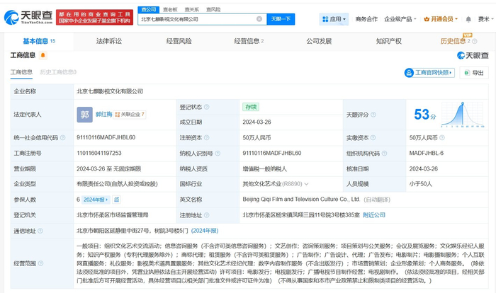 天眼查App显示,李小冉签约的MCN公司北京七麒影视文化有限公司成立于2024年3月,法定代表人为郭红梅,注册资本50万人民币,经营范围包括组织文化艺术交流活动、信息咨询服务、文艺创作等,由郭红波、郭红梅共同持股。