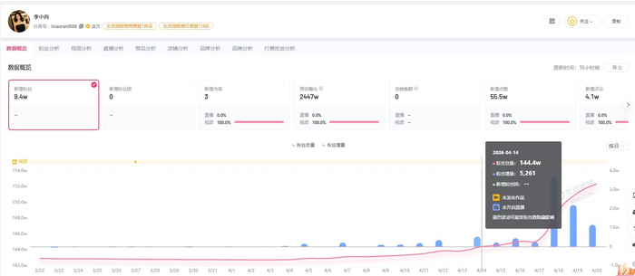 第三方数据显示,截至4月21日下午3点,李小冉短视频账号粉丝数为153.6万,近一周涨粉9.2万。