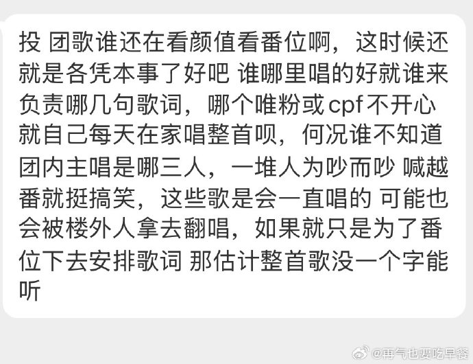部分网友主张“按实力分配”优于“按番位分配”,认为主唱组(如马嘉祺、宋亚轩、张真源)应承担更多段落。但反对者强调,时代少年团作为明确番位制的团体,随意打破规则会动摇商业模式根基,呼吁公司“要么遵守番位,要么废除番位”。