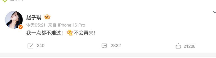 然而她也坦露了一个让不少观众心疼的细节:被淘汰后,节目组不让取包。" 当时有点感觉失落," 赵子琪在直播中说道," 就是那种 …… 好像被关在门外的感觉。" 她并未过多渲染情绪,但这段话让不少网友感受到淘汰背后的复杂滋味。
