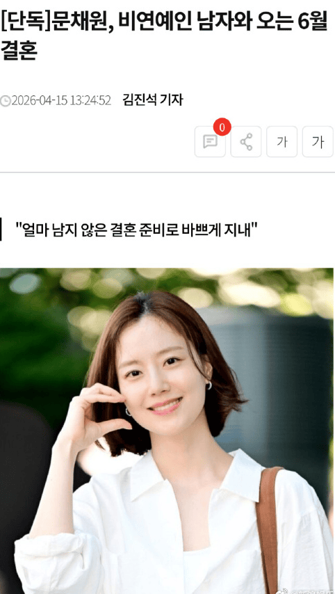 2026年4月15日,韩国演员文彩元正式宣布将于今年6月与圈外男友结婚,目前正忙于筹备非公开婚礼,引发全网祝福热潮!