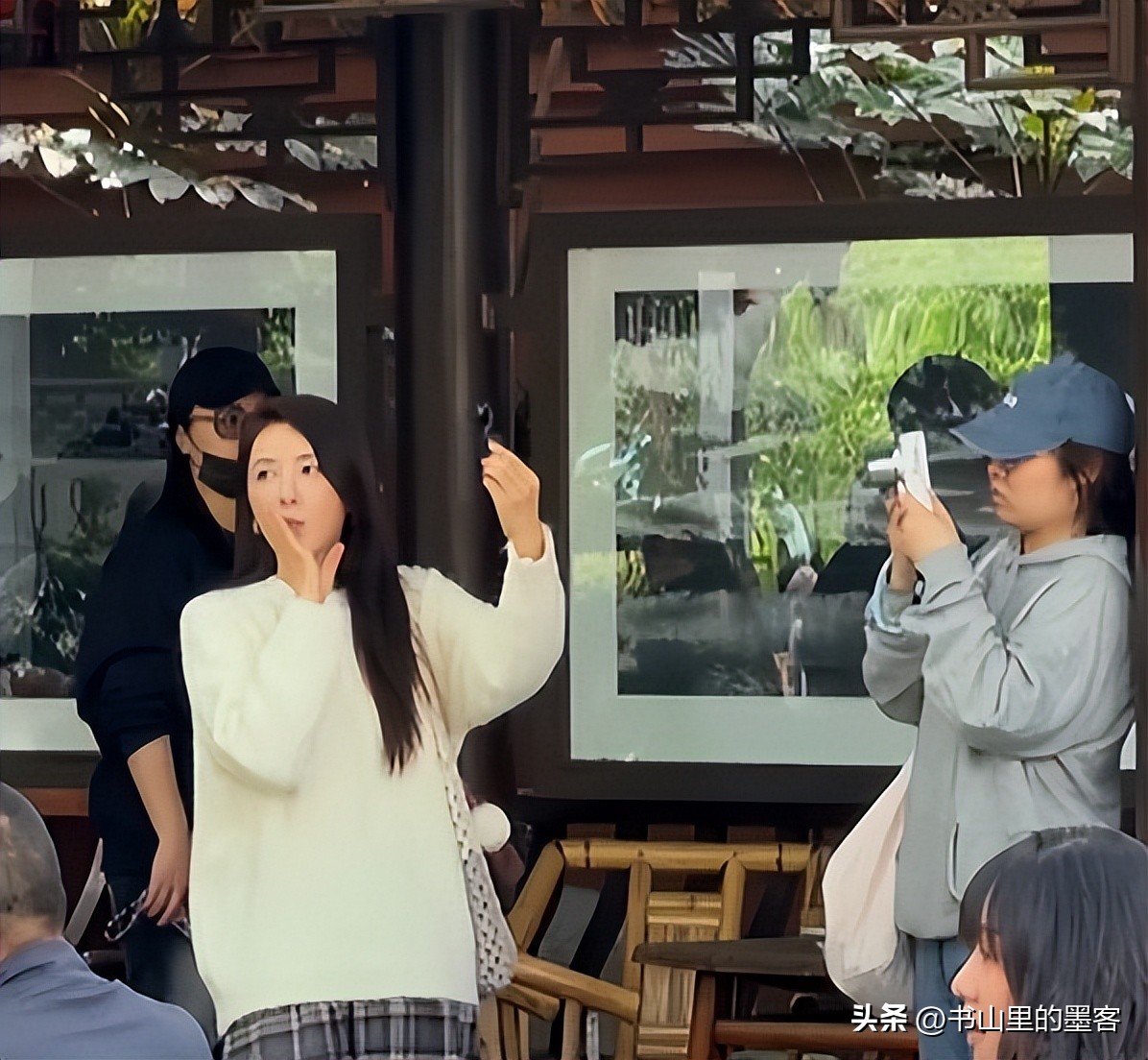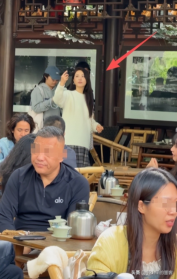 当时她站在街边的店铺旁,拿着手机不停地拍照,脸上妆容清淡,皮肤状态看着不错,没有明显的皱纹,个子高挑的她站在人群里,本应很显眼,可周围的游客都忙着自己的事,也没人认出她,大家都自顾自地喝茶、聊天。