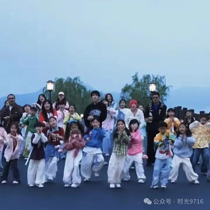 只见林依轮穿着黑卫衣牛仔裤,一个人带着一群小孩,在湖边边唱边跳。