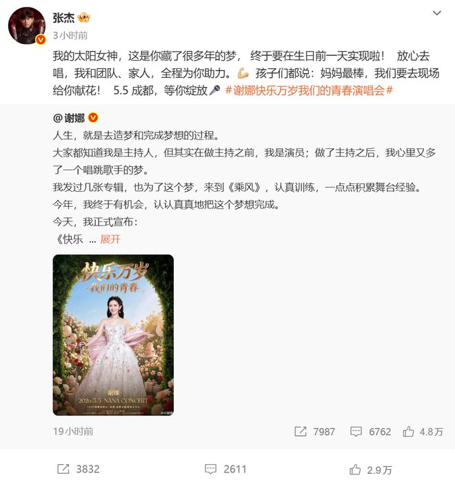 谢娜定于5月5日(其生日前一天)在成都金融城演艺中心举办个人演唱会,主题为“快乐万岁·我们的青春”,既呼应了她多年主持生涯积累的粉丝情怀,也圆了自己藏了很多年的歌手梦。而张杰的全力支持,成为这场演唱会最受关注的亮点之一。