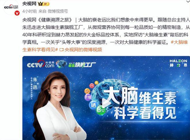 2026年4月11日中午11点,央视网发布了一则消息,宣布总台主持人朱迅首次出现在健康类节目中,带领观众走进《健康溯源之旅》。这期节目重点探讨了大脑衰老的科学真相,远比我们普遍认知的要早。朱迅带领观众深入大脑维生素的生产过程,参观了从微观营养协同到每一粒维生素精密制造的全过程。节目通过对40年科研积累和赫力昂9大金标品控体系的揭秘,带来了对“大脑维生素”背后科学的全面了解。这不仅是一场关于大脑健康的深度溯源之旅,更是一次科学与现实结合的深度探讨。