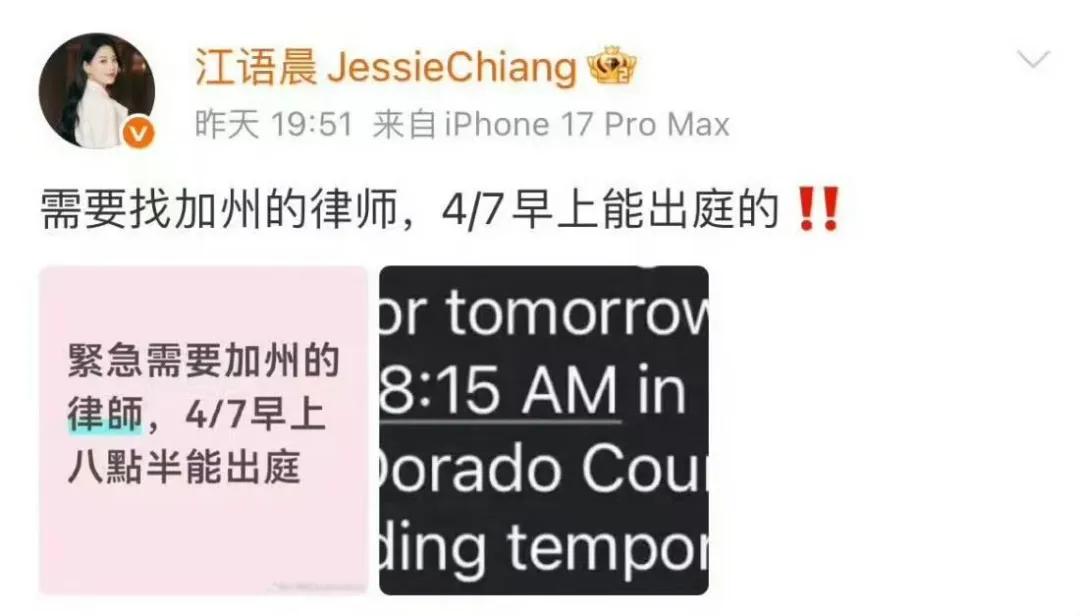 其实江语晨也挺不容易的,这两天还突然在个人账号上发文,“紧急需要加州的律师,4月7日早上八点半能出庭。”