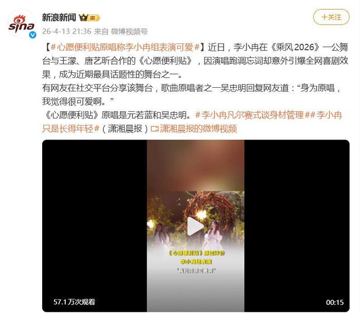 据4月13日晚间报道,李小冉在《乘风2026》一公舞台上,与王濛、唐艺昕合作的一曲《心愿便利贴》,因为演唱全程跑调忘词,却意外引爆了全网喜剧效果,成了近期最具话题性的“翻车”舞台。
