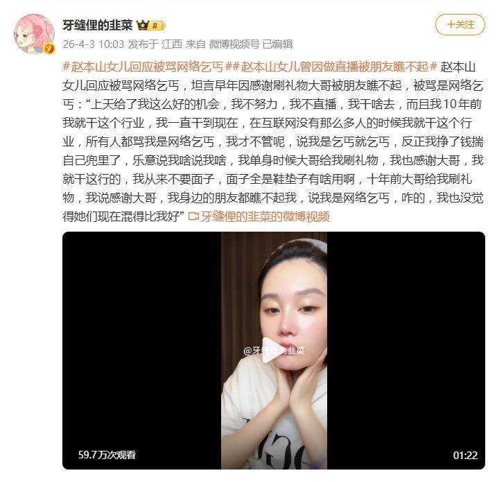 据网友4月3日爆料,赵本山女儿球球(原名赵珈萱)在直播间里的一番硬核发言,直接把“网络乞丐”这个话题怼上了热搜。面对长达十年的嘲讽,她一句“反正我挣了钱揣自己兜里了,乐意说我啥说我啥”,把“合法赚钱,爱说啥说啥”的态度甩在了公众面前。