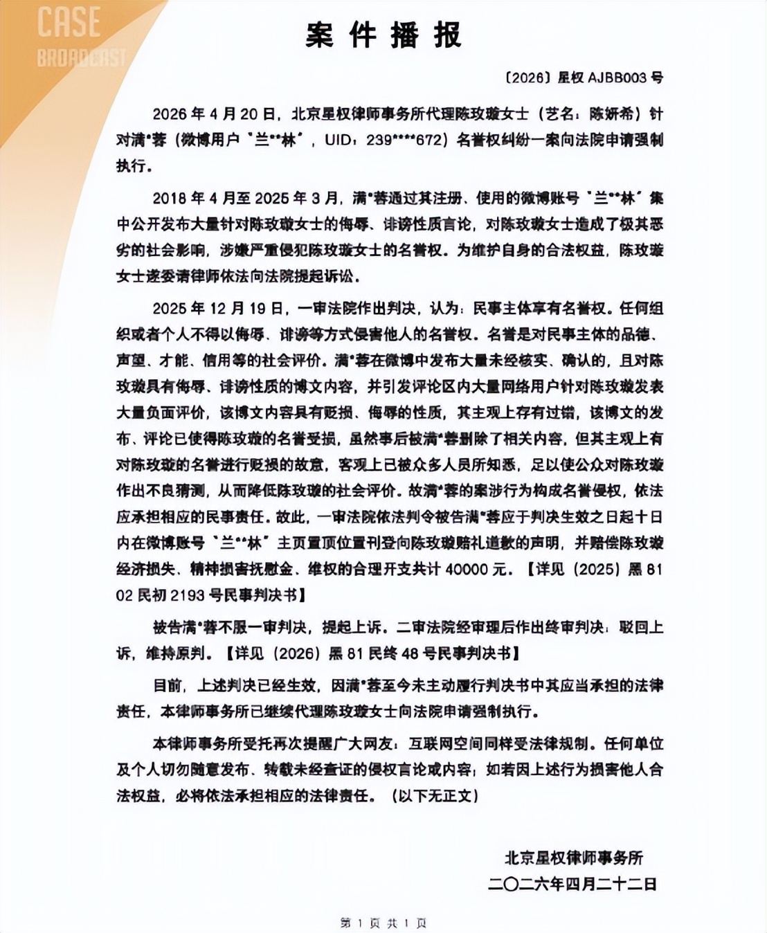 说起来陈妍希这次维权真的挺不容易的。原来早在2018年到2025年这段时间里,有个叫"蓝色的林"的网友在网络上持续发布针对她的不实言论,严重侵犯了她的名誉权。这种长期的网络骚扰其实比一次性的攻击更伤人,毕竟它像细沙一样一点点磨损着一个人的内心和形象。去年12月一审法院就认定了这是侵权行为,要求被告在10天内发道歉声明还要赔4万元,二审也驳回了上诉,但对方就是不肯执行。
