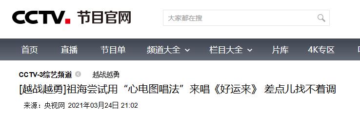 央视网——[越战越勇]祖海尝试用“心电图唱法”来唱《好运来》 差点儿找不着调