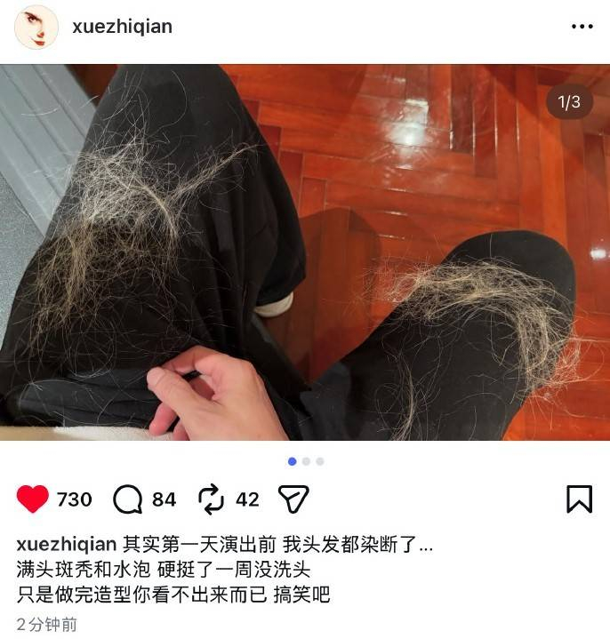 搜狐娱乐讯 9日,薛之谦在社交平台上发文称:“其实第一天演出前,我头发都染断了…满头斑秃和水泡,硬挺了一周没洗头,只是做完造型你看不出来而已,搞笑吧。”