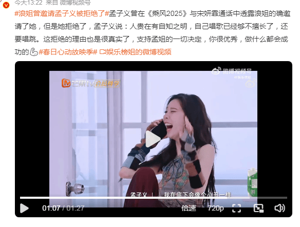 尽管缺席节目,孟子义在《乘风2026》(《浪姐》第七季)中意外刷足存在感。