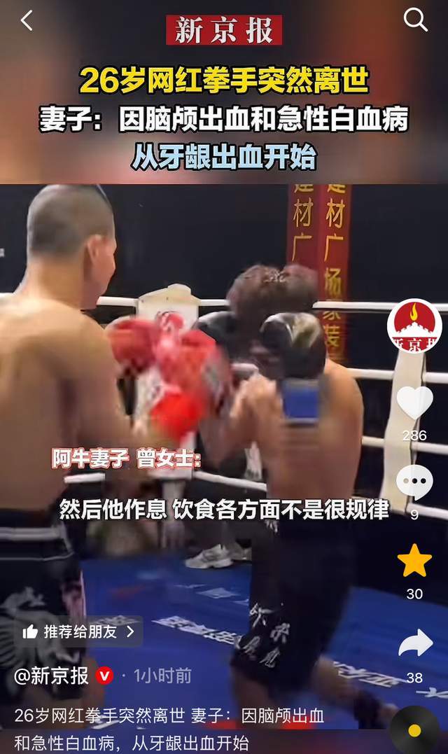 # 26岁就走了,真的是“不该有的悲剧”——云南网红拳手“阿牛”去世,原因竟与熬夜息息相关,云南一位年仅26岁的网红拳击手“阿牛”突然去世,引发了广泛关注,这位从小便痴迷拳击的佤族小伙,居然在短短的职业生涯中就走到了人生的尽头,真是让人唏嘘不已。,阿牛本名田岩映,家在云南临沧孟定,从小就对拳击充满热爱,最终辍学跟随拳击生涯,凭借出色的实力,他在广州的拳击圈里慢慢崭露头角,甚至成为了一名拳击教练,但人生的起伏却让他一家陷入了深深的痛苦。,这位年轻的拳击手留下了一岁多的可爱儿子,据妻子透露,他的去世并非单纯的疾病导致,而是双重因素的结果,阿牛在职业生涯中为了追求“硬拽”的人设,日夜不停地训练和比赛,饮食作息完全不规律,习惯了熬夜,这种不良的生活习惯加上高强度的运动,给他的身体敲响了警钟。,据妻子回忆,阿牛去世前的几天,身体状况已经很不正常,经常高烧、头晕,甚至在休息时嘴角流血,医生诊断出,他是因为长期熬夜导致的血压过高,进而引发脑出血,同时还患有白血病,这两大病魔最终夺去了他的生命。,这位年轻的网红拳击手的悲剧,折射出当下社会中年轻人对拼命追求的“硬核生活”的代价,无论是职业选择还是生活方式,都需要以身体为重,希望更多的年轻人能够学会照顾自己,从熬夜、过度训练中解脱出来,给自己留下一片健康的身体,毕竟,健康才是最珍贵的财富,而身体一旦出问题,再强大的拳击实力也没用了。,阿牛的离去,不仅让家人和粉丝痛不欲生,也让我们看到了生活中那些看似“可以承受”的小习惯,背后可能隐藏着致命的隐患,无论是哪个领域,都要学会正确对待自己,放慢脚步,拥抱健康。