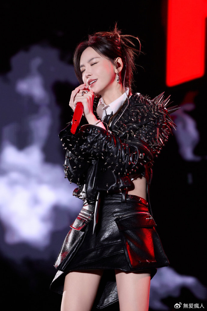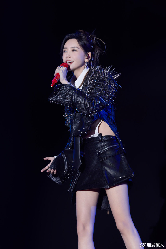 这身造型更是将她骨子里的不羁与洒脱展现得淋漓尽致。铆钉皮衣上的尖刺,像是她对世俗的挑战,宣告着自己的与众不同。短裙下露出的修长双腿,在舞台灯光的映照下,散发着自信的光芒。她手持话筒,眼神坚定地望向远方,仿佛在诉说着自己的音乐梦想和对未来的憧憬。