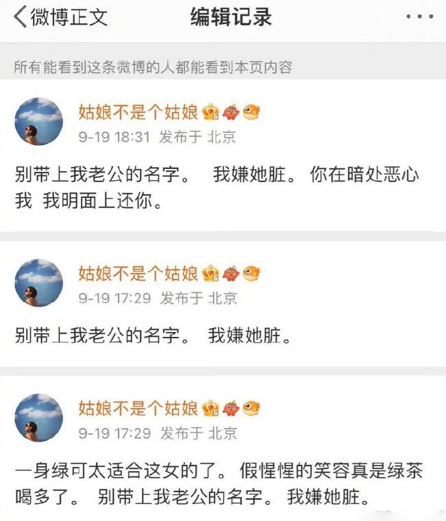 “别带上我老公的名字,我嫌她脏”,骂她是“假惺惺的绿茶”。