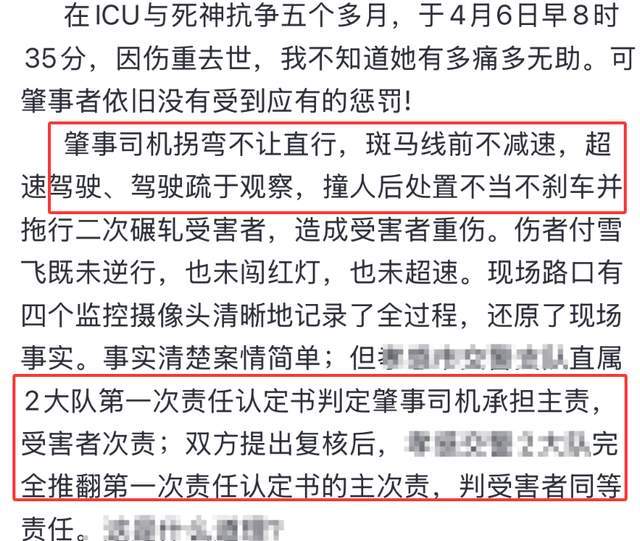 据付雪飞姐姐透露,起初的时候认定司机主责,但后续双方都提出了复核,最终两人承担同样的责任(事故的判责其实很复杂,尤其是后续去世的事件)。