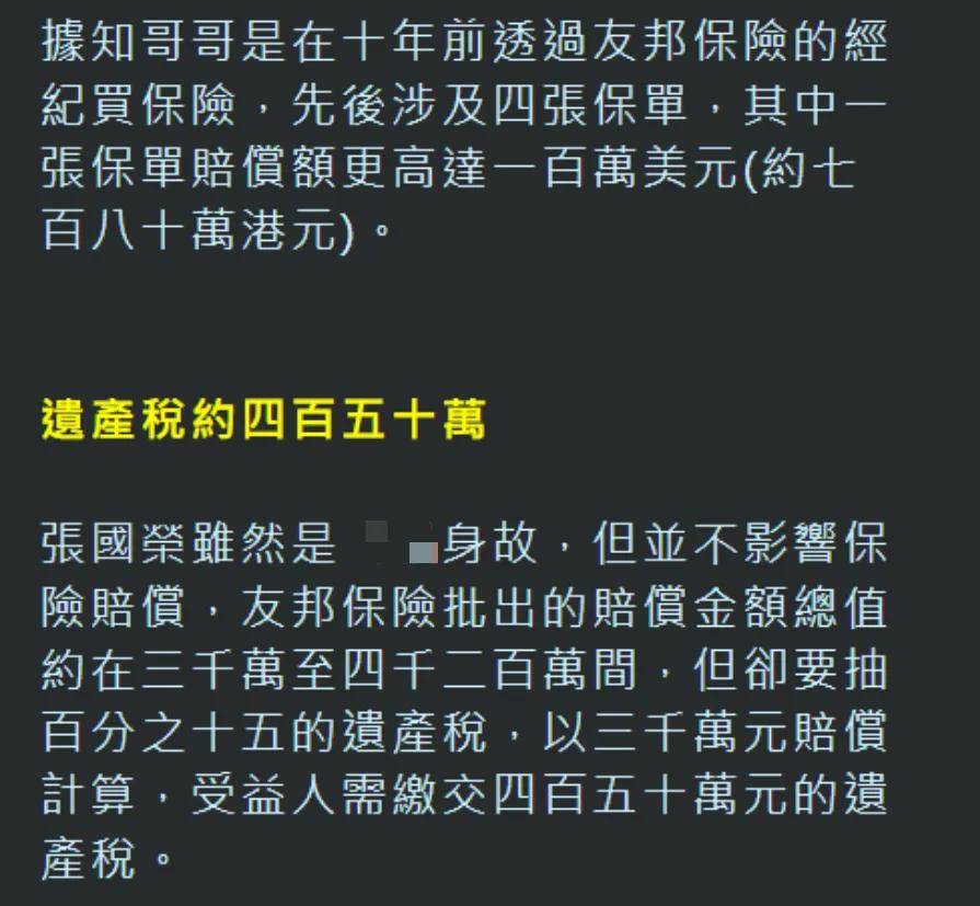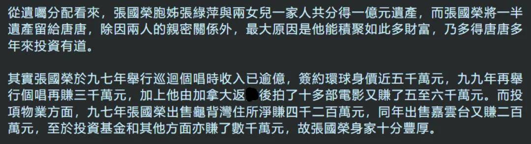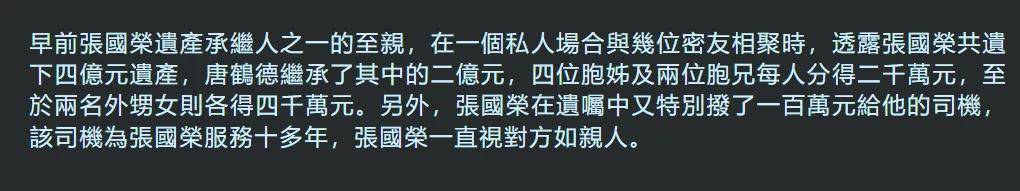 知情人透露,张国荣把一半遗产都给了唐鹤德,大约两个亿,剩下两个亿则是按照不同比例分给家人。