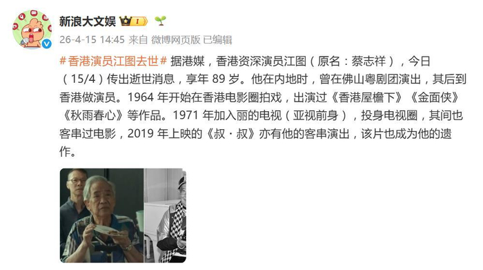 **吃瓜简评:江图去世,香港影视圈少了一道熟悉的“绿叶”**,啊,又一枚“绿叶”悄悄凋零了!香港老戏骨江图(原名蔡志祥)在4月15日早上因心脏病不幸离世,享年89岁,消息由田启文亲自对外公布,一句“真的走了”,为这位横跨粤剧、电影和电视圈数十载的老艺人画上了句点,这位“熟面孔”走了,唉,真是让人唏嘘啊!,说到江图,这名字在香港影视圈可不是个小人物,1936年出生的他,生于一个真正名副其实的粤剧世家,他的母亲冯侠华是当年的粤剧女须生,曾与任剑辉同台;舅父冯侠魂是文武生,舅母楚岫云更是粤剧界的大名伶,家学渊源深厚,19岁便随舅父去内地演出,后来在佛山粤剧团练就一身扎实的功底,可当他到香港时,已经是“江涛”了,后改名为“江图”,寓意“大展宏图”。,1964年,江图正式开启了他的电影生涯,出演了《香港屋檐下》《金面侠》等经典作品,不过他真正的黄金时代是在电视圈,尤其是在亚视的几十年里,他出演了无数经典剧集,大地恩情》《大侠霍元甲》《我和僵尸有个约会》《民间传奇》《书剑恩仇录》《陆小凤》等等,无论是塑造反派角色还是正面角色,江图都能游刃有余,演技稳扎稳打,是业界公认的“甘草演员”。,但话说到这里,你们可别以为江图这辈子光是为了表演而活的,说到他的个人生活,他一生未婚,这点可真是让人唏嘘,更让人心疼的是,2017年,他的契仔江晖因肝癌去世,江图曾说“人生最悲痛的莫过于失去挚爱的亲人”,这段经历对他打击得极为沉重,尽管如此,他依然挺身而出,在2019年客串电影《叔·叔》,饰演“超仔”一角,演出细腻自然,成为他的银幕遗作。,说到江图,真想为他为他骄傲!从粤剧舞台到影视荧幕,从翩翩少年到耄耋老者,他用一生诠释了什么是忠诚与担当,他虽然未婚,但他用演艺的热情和努力,填补了所有的空虚,香港影视圈少了他,真的是少了一道熟悉的“绿叶”,那片他曾经活跃的“香港屋檐下”,自此少了一道身影。,江图的离去,不仅是香港影视圈的集体记忆的封存,更是对一代观众情感的告别,虽然他已不在人世,但他的作品和精神依然在我们心中生根发芽,继续发芽,老戏骨江图,真的是一颗闪耀的星,永远值得我们铭记。