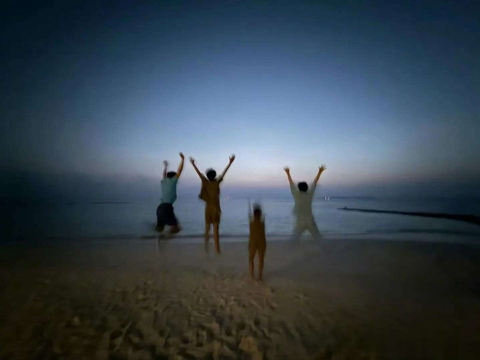 另一张照片中,他们在海边做跳跃动作的瞬间被抓拍了下来。邓超一如既往地做出最搞笑的动作,等等则变得越来越高大,今年他已经长得比去年高了不少,宛如一个小青年。孙俪则跳得极快,动作模糊得几乎看不清,而小花这次似乎跳得稍慢,才刚刚起跳,但她依然散发着青春的气息。