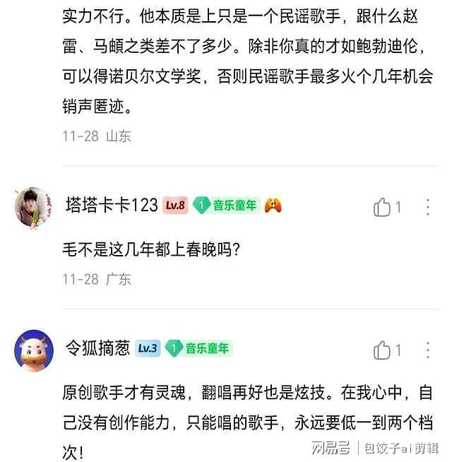 **吃瓜简评:毛不易高开低走,网友自测原因,自测答案**,近年来,毛不易的音乐事业从巅峰直坠深渊,让不少乐迷痛不欲生,这位曾经“华语乐坛巨擘”的毛不易,到底是怎么从“全民神曲”到“无人问津”的?咱们来一起来分析这背后的原因吧!,### 一、早年成就:从无名到巅峰,毛不易的崛起,可以说是华语乐坛的一次奇迹,他的歌曲仿佛都沾了魔水,令人一听就深深陷入其中,像《消愁》这样的歌曲,以简朴的旋律和深刻的歌词,勾勒出现代人面对生活压力时的无奈与迷茫,引发了无数人的共鸣,更别提《像我这样的人》这样的经典作品,简直是每个90后青春的主题曲。,毛不易的成功,不仅仅是因为他的音乐才华,更是因为他完美地把握了当时乐迷的审美需求,他那一瞬间的叙事风格和细腻的情感表达,成为了华语流行音乐的标配,他的每一首歌都像是生活的写照,勾勒出每个人内心深处的情感波动。,### 二、高开低走的原因:一场戏剧性的逆转,随着时间推移,毛不易的音乐风格逐渐陷入了一个死胡同,他的作品开始显露出明显的单一特征,那种带着“丧气”的风格虽然在一部分粉丝中引发共鸣,但对更广泛的听众来说,难免会出现听腻的感觉,这种“单一化”在现代音乐市场显得尤为可怕,因为听众们对多样化的音乐体验有着更高的要求。,除了音乐风格的单一化,毛不易在综艺节目中的“佛系态度”也成为了争议的焦点,他在节目中展现出的随和与沉稳,虽然让他在竞争中显得独特,但也引发了人们对他的音乐创作动力的担忧,在音乐行业,保持积极的竞争心态和追求极致的表现,往往是成功的关键因素之一,而毛不易似乎已经不再追求这些,反而将音乐当作了一种生活的调剂。,### 三、网友自测原因:自测答案,不少网友在评论区给出了自己的“吃瓜答案”,有人认为,毛不易的音乐风格确实开始显得单调,缺乏创新和多样性,与早期的佳作相比,近期的作品常常让人感觉“老套”,还有人调侃道:“毛不易的歌,其实就是一味地唱‘丧’,简直像是在进行某种‘情感工业化’!”,更有趣的是,有网友对毛不易的“佛系态度”提出了质疑,他们认为,如果一个音乐人在综艺节目中表现得太随和,可能会让人对他的音乐创作能力产生怀疑,毕竟,音乐创作需要激情与热情,而不是一味地沉稳与佛系。,### 四、吃瓜总结:高开低走的深层原因,从市场需求的角度来看,毛不易的音乐风格确实存在一定的局限性,在这个信息爆炸的时代,新兴音乐人以独特的风格和创新的方式迅速崛起,吸引了大量的耳朵,毛不易的作品虽然曾经“出圈”,但在市场竞争中逐渐失去了自己的定位。,更深层次的原因,可能是毛不易本人在音乐上的成长停滞,早期的创作能力让人惊叹于他的才华,但近期的作品未能达到昔日的高度,音乐市场对“出圈”的追求需要不断的灵感与突破,而毛不易似乎在这方面逐渐失去了灵感。,### 五、未来展望:吃瓜专家的建议,对于毛不易未来的发展,咱们吃瓜专家给出了三点建议:,1. **保持自我,重拾热情**:毛不易的音乐风格虽然在某些人心中有着独特的地位,但这并不意味着他不能尝试新的风格和体验,音乐的魅力在于不断的探索和突破。,2. **与时俱进,迎接多样化**:现代听众对音乐的需求已经发生了很大的变化,毛不易需要在保持自我风格的同时,尝试更多的音乐类型,满足不同听众的需求。,3. **重拾创作热情**:音乐创作需要不断的努力和热情,毛不易如果只是将音乐视为生活的调剂,那么他的创作能力很可能会停滞不前。,### 六、吃瓜大结语,毛不易的高开低走,虽然让人唏嘘,但这也成为了华语乐坛变迁的一个缩影,音乐市场的变化、听众需求的升级、艺术家成长的停滞,这些因素共同导致了毛不易的事业低谷。,毛不易的音乐之路仍在继续,无论结果如何,重要的是他在探索中不断成长,始终保持对音乐的热爱与追求,毕竟,音乐不仅仅是为了成功,而是为了表达内心的情感与世界的视角。,咱们给予毛不易一个鼓励:希望他能重新找回音乐的热情,迎来新的突破与高峰!毕竟,他的音乐曾经感动了无数人,而未来也许会有更多感动的时刻。