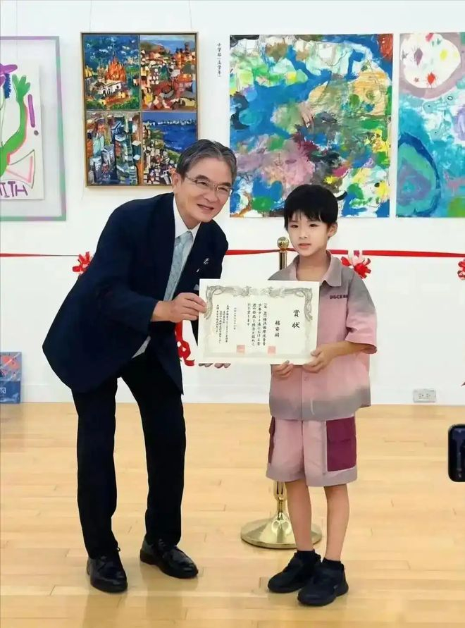 更让人意外的是,这小伙子还是个隐藏的绘画大神。今年7月在东京的国际画展上,他的水彩作品和黄圣依儿子杨安鳞的作品一同展出,还顺利拿了奖。策展方特别提到他的画 “色彩激烈却线条克制”,像把摇滚乐的躁动融进了画布,这独特的艺术感知力,估计是遗传了爸妈的艺术细胞。