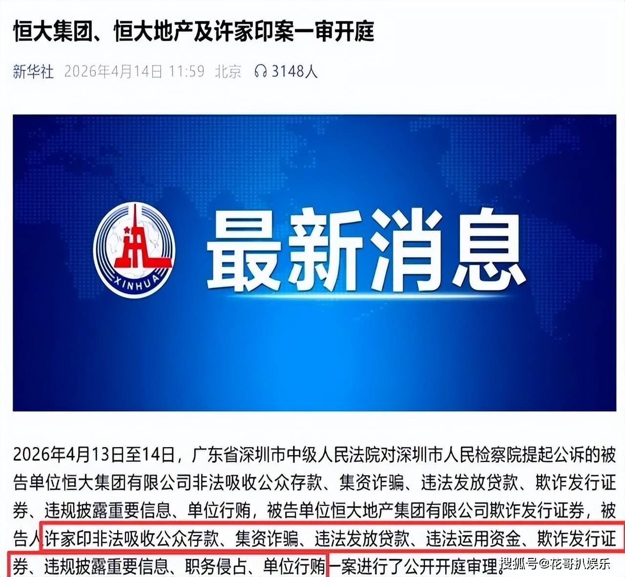 4月13日到14日,深圳中院公开审理恒大集团、恒大地产及许家印案,检方指控的罪名一长串,包括但不限于非法集资、集资诈骗、违规放贷、财务造假、违法运用资金、行贿,桩桩件件都是重罪,涉案金额更是天文数字,数万亿资金在他的操作下不知所踪,恒大经济案堪称近年来最重磅的经济大案。谁也没想到,曾经在发布会上意气风发、喊着“恒大永不倒”的许家印,这次在法庭上彻底老实了,当庭直接认罪悔罪,没有任何狡辩,和之前的嚣张模样判若两人。