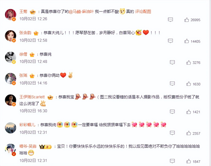好友王菊晒出与李纯在登记处的合照并留言“一点都不酸”,李纯回应“回来炫饭”,马頔接梗“一家人”尽显亲密。张含韵、徐僧、张瑶等数十位明星也送上祝福。