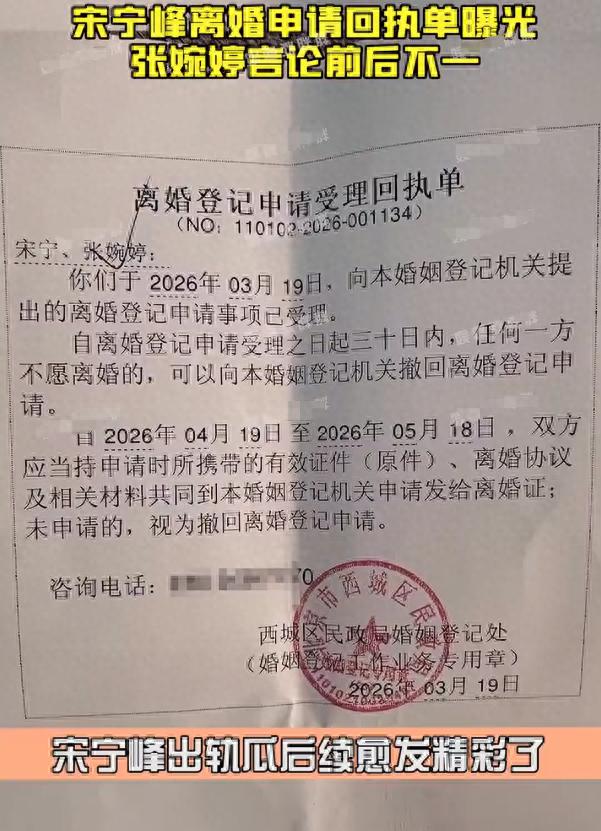 本以为宋宁峰这个瓜已经凉了,男人怂退圈,妻子大度原谅,没想到还有一张离婚回执单,直接把所有人的假象都给撕碎了,今天第三者Q女士一出手,直接甩出离婚登记申请受理回执单,白纸黑字盖着公章,彻底打脸了张婉婷那一番“不离婚”的表演。,这张回执单里清清楚楚写着,上个月俩人就已经提交了离婚申请,可这段时间,比男方丑闻曝光的时间点早了将近半个月,这意味着张婉婷在后来直播间里那番“肝胆相照、不离婚”的表演,完全是装出来的,谁能忘记她对着镜头深情款款地说:“早就不是爱不爱的问题了,是肝胆相照,他现在落难了,我不能丢下他不管”?真是太上头了。,更离谱的是,她一边在直播间里痛不欲生地分享老公每天的“苦日子”,一边挂着带货链接,把自己塑造成天真的完美妻子,可没想到,这么多感人至深的发言,其实全是建立在谎言之上的,两人早在丑闻曝光前就已经决定离婚,冷静期都快结束了,她却在网上扮演不离不弃的圣母。,嘴上说着不在乎爱不爱、要肝胆相照,身体却很诚实地提交了离婚申请,更被曝出当初自己也和Q女士一样,是个“三姐”,这简直让人直呼“服”,没想到还有高手啊。,这还不得不说是一家人不进一家门,一张离婚回执单,扯下了所有人的遮羞布,哪还有什么肝胆相照,不还是为了钱吗?现在看到热度起来了,三姐开始露脸直播,张婉婷离婚回执单都晒出了,还在那嘴硬带货。,虽然他们都为自己的行为买单,但让孩子长大后怎么看待这段的不堪的关系呢?不知道您对此有什么看法呢?欢迎在下方评论区留下你的想法,喜欢文章记得点赞关注我们下期再见。,[免责声明]文章的时间、过程、图片均来自于网络,文章旨在传播正能量,均无低俗等不良引导,请观众勿对号入座,并上升到人身攻击等方面,观众理性看待本事件,切勿留下主观臆断的恶意评论,互联网不是法外之地,本文如若真实性存在争议、事件版权或图片侵权问题,请及时联系作者,我们将予以删除。,信息来源:,- 百度百科:宋宁峰、张婉婷,- 搜狐娱乐:#宋宁峰被曝婚内出轨#,- 扬子晚报:张婉婷宋宁峰出“售后”!,- 九派新闻:《再见爱人》嘉宾宋宁峰老婆张婉婷官宣怀二胎,- 新浪网:演员齐溪宣布与宋宁峰离婚:时间给予我们成长,- 又反转了!宋宁峰离婚回执单被曝,三姐露脸,张婉婷算计藏不住了