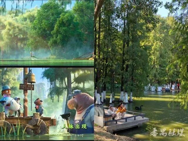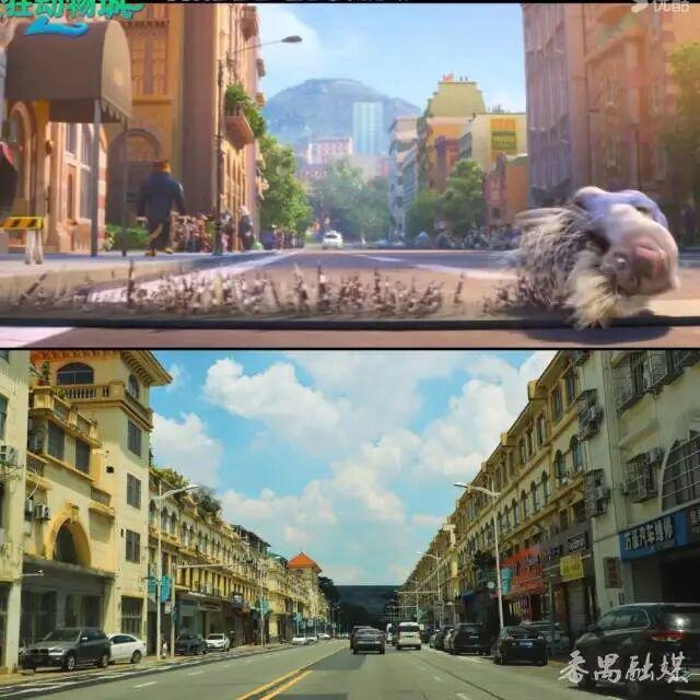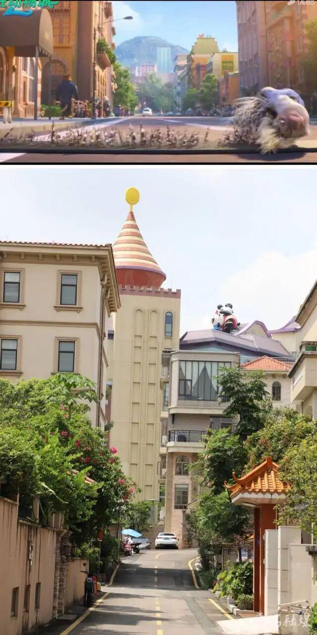 影片中的小型锯齿动物镇(左)和广州海洋世界内的童话街区布景(右)