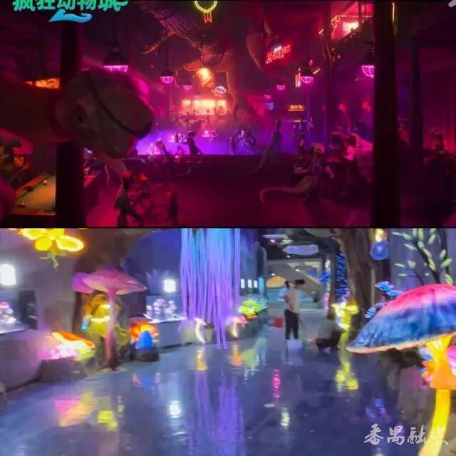 神秘的爬行动物聚居地,也对应了广州海洋世界的“奇幻潘多拉森林”。发光蘑菇装饰、幽蓝迷离的光线,营造出同样奇幻的秘境氛围。