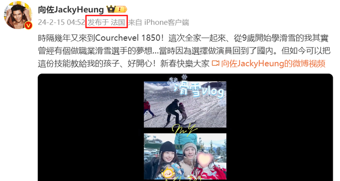 向佐晒出了滑雪Vlog,他配文“时隔几年又来到了Courchevel1850(位于阿尔卑斯山),这次全家一起来,从9岁开始学滑雪的我其实曾经有个做职业滑雪选手的梦想,当时因为选择做演员回到国内,但如今可以把这份技能教给我的孩子,好开心,新春快乐大家。”