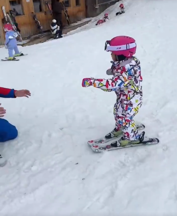 向佐先是认真教女儿滑雪,小奶皇的领悟力超高,不到一会就能独立站起来并且自己缓慢往前滑,向佐直夸女儿超棒,担心女儿在滑雪过程中受伤,滑雪教练在一旁跟着,向佐也在一旁扶着女儿前行。