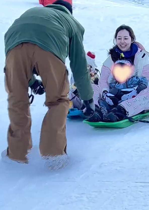 在滑雪过程中,向佐很照顾妻子和孩子,他充当“车夫”,拉着郭碧婷和孩子往前滑,坐在滑雪板上的郭碧婷乐开了花,俩孩子也玩得很开心,向佐累而幸福着。